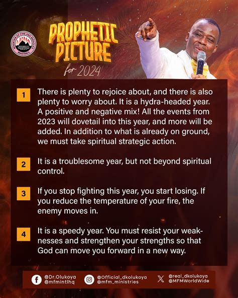 When we think about the 2024 prophecies by Adeboye , it’s helpful to consider the different areas they might cover. Based on previous years, we can anticipate insights into several key aspects of life. Economically, the prophecies might address issues such as inflation, job creation, and investment opportunities. Adeboye could offer guidance on how individuals and businesses can navigate economic challenges and thrive in the coming year. Politically, the prophecies might touch on elections, governance, and social justice. He could call for prayers for peaceful elections, wise leadership, and an end to corruption and injustice. Socially, the prophecies might address issues such as family values, education, and healthcare. Adeboye could emphasize the importance of strong families, quality education, and accessible healthcare for all. Environmentally, the prophecies might touch on climate change, natural disasters, and sustainable living. He could encourage people to be responsible stewards of the environment and to take action to protect the planet. Spiritually, the prophecies will likely focus on personal growth, discipleship, and evangelism. Adeboye could challenge believers to deepen their faith, make disciples of all nations, and live out their Christian values in every sphere of life. By considering these different areas, we can better understand the potential scope of the 2024 prophecies and how they might apply to our lives.