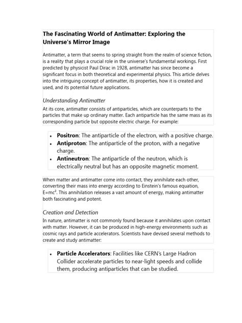 So, before we jet off to an antimatter world , we gotta get a handle on what antimatter actually is. Think of it as the mirror image of ordinary matter . For every particle we know and love, like an electron with its negative charge, there’s an antiparticle – in this case, the positron, which is identical in mass but has a positive charge. Same goes for protons and their antiparticles, antiprotons (which have a negative charge), and neutrons and antineutrons (which are electrically neutral but have opposite magnetic moments). It’s like matter got dressed in a funhouse mirror! The real kicker, though, is what happens when matter and antimatter meet. They annihilate each other, releasing a massive amount of energy. This is governed by Einstein’s famous equation, E=mc², where a tiny bit of mass converts into a huge amount of energy. This annihilation process is the most efficient energy conversion known, way more potent than nuclear fission or fusion. Physicists have been able to create tiny amounts of antimatter in particle accelerators, like the Large Hadron Collider, but producing enough to even see would require unimaginable amounts of energy. It’s incredibly rare and unstable in our universe, which is why we don’t just trip over antimatter lying around. But the fundamental laws of physics suggest that antimatter should exist, and if it does, it could form its own ‘opposite’ structures, leading to the idea of an antimatter world.