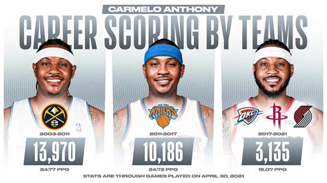 After his stellar performance at Syracuse, Carmelo Anthony entered the 2003 NBA draft, a class that included other future superstars like LeBron James, Dwyane Wade, and Chris Bosh. Drafted third overall by the Denver Nuggets, Carmelo immediately made an impact. His scoring ability was evident from day one, and he quickly became a fan favorite. In Denver, he had the opportunity to develop his skills and grow as a player. His scoring ability was undeniable, and he quickly became a cornerstone for the Nuggets. His presence transformed the Nuggets into a playoff contender. He had a great supporting cast around him, making it easier for him to thrive. In his early years with the Nuggets, Carmelo showed the world his potential, displaying a scoring prowess that would make him one of the league’s top scorers. He was known for his smooth jump shot and ability to create scoring opportunities. His performances were remarkable, and he quickly became one of the NBA’s most exciting players to watch. He became a primary scorer on the Nuggets, and his scoring ability made the team competitive. The combination of his scoring, charisma, and the team’s playoff aspirations made him an instant sensation. This was the start of an amazing journey, where Carmelo displayed his scoring talent and started the process of building his remarkable career stats. The journey in Denver was critical to establishing his reputation and the foundation for his career achievements. This was the launching pad for his NBA career, where he began to build the foundation for his impressive scoring statistics. The impact of his time in Denver is a crucial chapter in understanding Carmelo Anthony’s all-time points . He made his mark in the NBA from the very beginning. His arrival marked the beginning of his journey towards becoming a scoring legend.