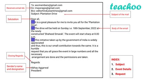 Keywords to remember: subject line example, greeting example, body composition, closing example, signature format, descriptive language, clear and concise writing.