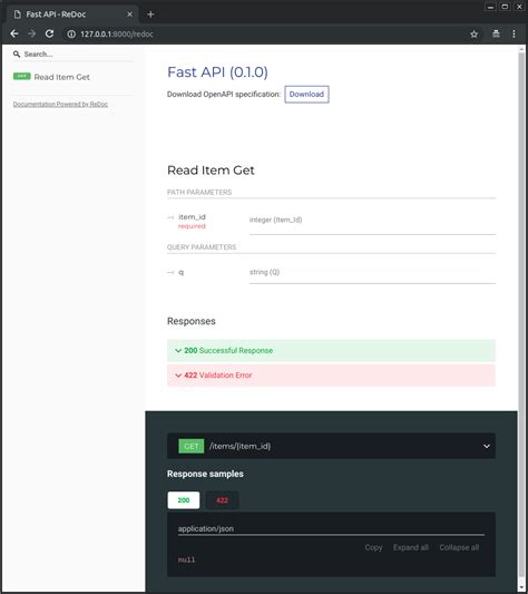 • http://127.0.0.1:8000/redoc : For ReDoc documentation.