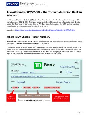 • Bank Institution Number: This is a three-digit number that identifies the financial institution itself. For TD Bank, the institution number is always 004.