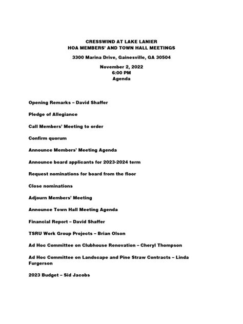 Alright, let’s break down the absolute must-haves for your HOA town hall meeting agenda. These are the building blocks that will ensure your meeting is comprehensive and covers all the bases. First up, you absolutely need Welcome and Introductions . This might sound basic, but it’s crucial, especially if you have new residents or board members. A warm welcome sets a positive tone, and a quick introduction of who’s who helps everyone feel comfortable and know who they’re addressing. Keep this brief – maybe 5 minutes tops. Next, we have the Approval of Previous Meeting Minutes . This is a standard procedural item. It ensures that everyone agrees on the record of the last meeting. Usually, the minutes are distributed beforehand, so attendees have had a chance to review them. This step is typically quick, involving a motion to approve. Following that, we dive into the Reports . This is where different committees or board members can update the community on their progress and activities. Think about categories like: Financial Report (budget status, upcoming expenses), Architectural Review Committee Report (updates on new builds, renovations, compliance issues), Landscaping/Maintenance Report (groundskeeping updates, upcoming projects), and Social Committee Report (upcoming events, feedback on past events). Tailor these reports to what’s most relevant to your community at that time. Give each report a specific time allocation to keep things moving. Crucially , you need a section for New Business and Discussion Topics . This is the heart of the meeting where new issues are raised and discussed. It’s essential to have a clear process for how new topics are added to the agenda – ideally, residents should submit them in advance. This allows the board to prepare and address them effectively. When discussing, encourage respectful dialogue and focus on solutions. This section often requires the most time, so plan accordingly. Open Forum / Q&A is another vital segment. This is your residents’ chance to ask questions, voice concerns, and provide feedback directly to the board. It’s a fantastic opportunity for transparency and community engagement. To make this effective, set clear guidelines: perhaps limit each speaker to a certain amount of time, and encourage questions to be directed to the board rather than engaging in debates with other residents. This ensures everyone gets a chance to speak and keeps the discussion productive. Finally, you need Action Items and Next Steps and Adjournment . This is where you summarize what was decided, assign responsibilities for any action items, and set deadlines. This ensures accountability and that things actually get done. A clear summary reinforces the meeting’s outcomes. Then, a formal adjournment brings the meeting to a close. Remember, always clearly state the date and time of the next meeting. A well-structured agenda with these components will make your HOA town hall a breeze! Remember to always include the date, time, and location of the meeting prominently at the top of the agenda.