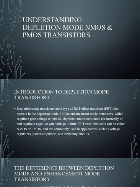 - Analog Circuits: While primarily used in digital circuits, NMOS and PMOS transistors also find applications in analog circuits, such as amplifiers and filters. They can be configured to amplify weak signals, filter out unwanted noise, and perform other signal processing functions. CMOS-based analog circuits offer low distortion, high linearity, and low power consumption, making them suitable for a wide range of applications.