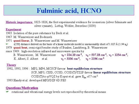 Okay, let’s dive deeper into how this crazy compound, ortho fulminic acid , is made and what makes it tick. First off, synthesizing ortho fulminic acid is not something you can whip up in your kitchen. It’s a delicate process that requires specialized lab equipment and a whole lot of expertise. The most common method involves the reaction of certain metal fulminates with a strong acid under very controlled conditions. For example, you might start with mercury fulminate or silver fulminate, which are themselves pretty sensitive compounds. When these are treated with an acid, like hydrochloric acid, ortho fulminic acid can be formed as an intermediate.