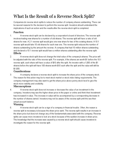 Let’s get down to the nitty-gritty of why a company would perform a reverse stock split . Unlike a regular stock split, which is often a sign of success, a reverse stock split is typically a maneuver performed by companies facing significant challenges. The most pressing reason, and often the primary driver, is to meet the minimum share price requirements of stock exchanges . Major exchanges like the Nasdaq and New York Stock Exchange (NYSE) have rules stating that listed stocks must maintain a minimum bid price, often around $1.00, for a sustained period. If a company’s stock price falls below this threshold, it faces the risk of being delisted. Delisting can be catastrophic for a company; it severely reduces liquidity, makes it difficult for investors to trade the stock, damages the company’s reputation, and can even trigger the acceleration of debt repayment. Therefore, a reverse stock split allows the company to artificially inflate its share price to comply with these listing requirements and avoid delisting. It’s a critical step to remain on a major exchange, which is vital for continued access to capital markets. Another significant reason is to enhance the stock’s image and attract a broader investor base . Stocks trading at very low prices, often referred to as penny stocks, are typically perceived negatively. They are associated with high volatility, speculative trading, and companies in financial distress. This low valuation can deter institutional investors, mutual funds, and even serious individual investors who prefer stocks with a more substantial per-share price. A reverse stock split aims to change this perception by increasing the stock’s nominal price. A higher share price can make the stock appear more substantial and less speculative, potentially attracting the attention of investors who wouldn’t consider low-priced stocks. It’s an attempt to shed the “penny stock” stigma and present a more stable, reputable image. Furthermore, some companies may use a reverse stock split to reduce the administrative costs associated with having a large number of shareholders . While less common as a primary driver, having a vast number of small shareholders can increase the complexity and cost of shareholder communications, dividend payments, and other administrative tasks. Consolidating shares can simplify these processes. However, it’s crucial to understand that a reverse stock split does not fundamentally improve a company’s business operations or financial health. It’s a financial engineering tactic. If the underlying business issues are not resolved, the stock price may continue to decline even after the reverse split. The market often views reverse splits with skepticism, interpreting them as a sign of weakness rather than strength. So, while it achieves the immediate goals of staying listed and potentially improving perception, it doesn’t solve the core problems a company might be facing.
